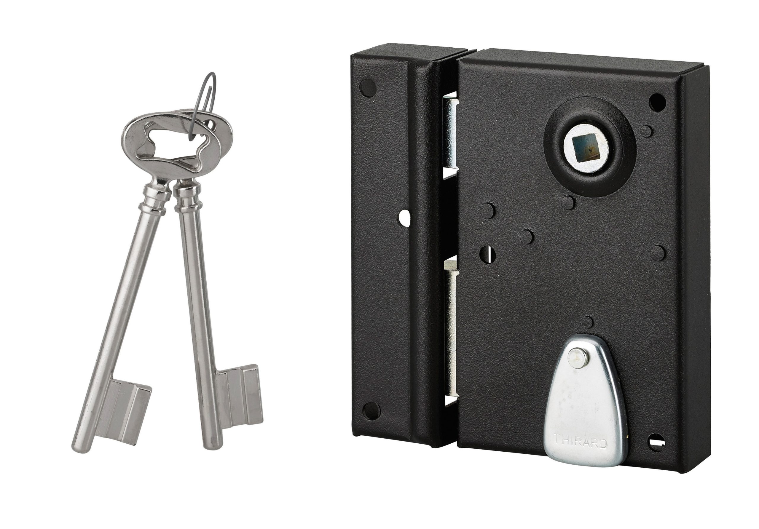 描述: 鋼拱形外殼和鋼扣板. 鋼門栓. 鋼門舌. 35毫米鋼襯套. 單檔轉動. 可逆轉門舌, 用於外開門. 7毫米梗孔. 2條鍍鎳匙. (托盤包裝附帶 1 條鍍鋅鎖匙). 6 不同鑰匙配置. 鋼鑰匙孔和梗座. 表面處理: 環氧黑色花崗岩 版本: 扣板可供大閘用. 左側或右側開啟. 用途: