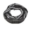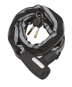 Description: Nylon sheathed cemented steel chain. Square 6 mm. 2 reversible keys. Finish: Black – reflective strip Version: With modifiable combination 5 viroles Use: Cycles – Motorcycles – Barrrières