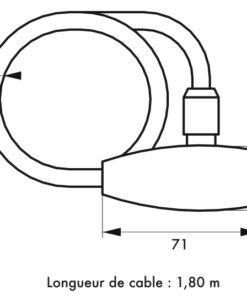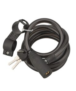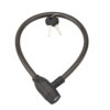 Description: PVC sheathed steel cable. Pin mechanism. Mounting bracket. 2 nickel-plated brass keys. Finish: Black Version: Use: Cycles
