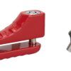 Description: Molded alloy body. Tubular key safety mechanism. 2 tubular keys in nickel-plated brass. Finish: Lacquered yellow – red Version: 263607 – with cable, disc mechanism, 2 keys. Use: Mounting on brake disc: Ø 5.5 mm for scooter – Ø 10 mm for motorcycle.