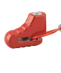Description: Molded alloy body. Tubular key safety mechanism. 2 tubular keys in nickel-plated brass. Finish: Lacquered yellow – red Version: 263607 – with cable, disc mechanism, 2 keys. Use: Mounting on brake disc: Ø 5.5 mm for scooter – Ø 10 mm for motorcycle.