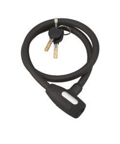 Description: PVC sheathed cemented steel cable. 2 reversible keys. Finish: Black Version: Use: Cycles – Motorcycles – Barrrières