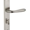 Description: Stamped steel plates. Molten alloy crutches. square steel 7 mm. Screws secable metals. Inter-axis of fixation 195 mm. Finish: Brushed nickel plated Version: Without hole for interior door. With condemnation button for bathroom door and W-C. With key hole for interior and exterior door. With European cylinder hole for exterior door. Usage: