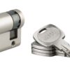 Description: European brass profile. Mechanism with 7 to 16 pins. Burglary protection of the protruding part of the cylinder (anti-snap). Anti-tearing panel. 3 keysreversible nickel-plated brass beds with property card. Option: Protection against needle drilling + 1st pin + hardened steel pusher. Finish: Nickel velvet Version: Half cylinder. Cylinder 2 inputs. Cylinder 1 button input. Emergency function: Possibility to insert a key into the cylinder and turn the panel even if a key is engaged inside (detachable panel). Padlock, thresher, contactor barrel. Adjustable panel for the dimension 30×10 (other dimensions on request). Possibility of mounting with detachable button. Use: Flowchart System