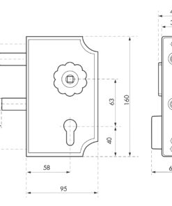 Description: Stainless steel lock, aluminum case. Adjustable deadbolt for tube from 30 to 60mm. Reversible, 1-turn mechanism, 8mm square, 58mm axis, EA 63mm. Finish: Black. Version: Use: Grid and exterior gate.