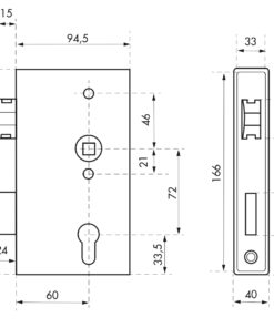 Description: Galvanized steel lock, raw steel trunk to be welded, 3mm protruding U-turn, 2-turn mechanism, 60mm axis, 8mm square, for PE cylinder. Finish: Version: Width 30mm, 40mm and 50mm. Use: Grid and portal.