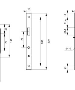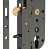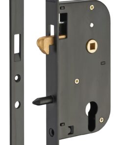 Description: Stamped steel chest. Steel headrest. Brass hook bolt. Flat steel striker. Square 7 mm, between axis 70 mm. Reminder of the hook by the key. Finish: Black Epoxy Version: Square headrest (BC). Headrest round ends (BR). With European profile cylinder. 30 x 30 mm, 3 keys. Use: Sliding door