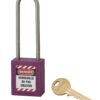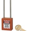 Description: Non-conductive ABS body. Stainless steel handle. Pin mechanism. Double anchoring. “Prisoner” key: the padlock must be closed to take back the key. 1 brass wrench. Comes with a set of labels. Finish: Red, orange, yellow, green, blue, black, purple, white, brown Version: Nylon handle dielectric protection, anti-sparks. Padlock on the same combination. Pass (PG, PGPP). Free key (on request). Option: without key retention and automatic closing. Use: Padlock resistant to shocks, heat, corrosion. Ideal for electrical applications. See usage table page 237