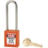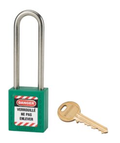Description: Non-conductive ABS body. Stainless steel handle. Pin mechanism. Double anchoring. “Prisoner” key: the padlock must be closed to take back the key. 1 brass wrench. Comes with a set of labels. Finish: Red, orange, yellow, green, blue, black, purple, white, brown Version: Nylon handle dielectric protection, anti-sparks. Padlock on the same combination. Pass (PG, PGPP). Free key (on request). Option: without key retention and automatic closing. Use: Padlock resistant to shocks, heat, corrosion. Ideal for electrical applications. See usage table page 237