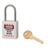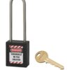 Description: Non-conductive ABS body. Stainless steel handle. Pin mechanism. Double anchoring. “Prisoner” key: the padlock must be closed to take back the key. 1 brass wrench. Comes with a set of labels. Finish: Red, orange, yellow, green, blue, black, purple, white, brown Version: Nylon handle dielectric protection, anti-sparks. Padlock on the same combination. Pass (PG, PGPP). Free key (on request). Option: without key retention and automatic closing. Use: Padlock resistant to shocks, heat, corrosion. Ideal for electrical applications. See usage table page 237