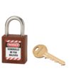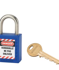 Description: Non-conductive ABS body. Stainless steel handle. Pin mechanism. Double anchoring. “Prisoner” key: the padlock must be closed to take back the key. 1 brass wrench. Comes with a set of labels. Finish: Red, orange, yellow, green, blue, black, purple, white, brown Version: Nylon handle dielectric protection, anti-sparks. Padlock on the same combination. Pass (PG, PGPP). Free key (on request). Option: without key retention and automatic closing. Use: Padlock resistant to shocks, heat, corrosion. Ideal for electrical applications. See usage table page 237