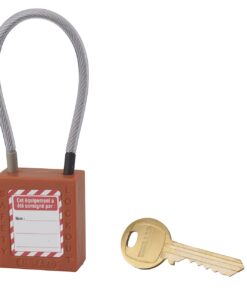 Description: Non-conductive ABS body. Sheathed stainless steel cable. Pin mechanism. 1 brass wrench. Comes with a set of labels. Finish: Red, orange, yellow, green, blue, black, purple, white, brown Version: Sheathed cable dielectric protection, anti-sparks. Padlock on the same combination. Pass (PG, PGPP). Free key (on request). Option: automatic closing on Ø 4.76. Use: Padlock resistant to shocks, heat, corrosion. Ideal for electrical applications. The flexibility of the cable allows the condemnation of devices on which a standard handle is not suitable.