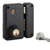 Description: Trunk and striker stamped steel. Bolt and half-turn galvanized steel. 2-turn mechanism. Reminder of the U-turn by the key. Square 7 mm. Brass cylinder inlet. Double brass cylinder with 5 pins. Ø 23 mm long. 45 mm. 3 nickel-plated keys. Possibility: Mounting with cylinder Transit 2 Finish: Epoxy black granite Version: A pull. Bolt and brass U-turn in canned packaging. Protection against tearing off the cylinder under shell conditioning. Usage: