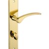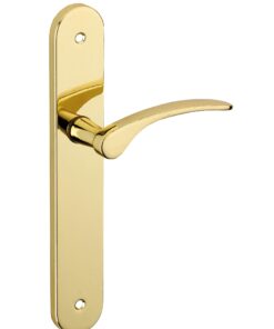 Description: Stamped steel plates. Molten alloy crutches. square steel 7 mm. Recall spring. Screws secable metals. Inter-axis of fixation 195 mm. Finish: Brass Version: Without hole for interior door. With condemnation button for bathroom door and W-C. With key hole for interior and exterior door. With European cylinder hole for exterior door. Usage: