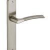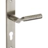 Description: Stamped steel plates. Molten alloy crutches. square steel 7 mm. Recall spring. Screws secable metals. Inter-axis of fixation 195 mm. Finish: Nickel-plated satin Version: Without hole for interior door. With condemnation button for bathroom door and W-C. With key hole for interior and exterior door. With European cylinder hole for exterior door. Usage: