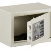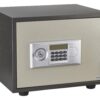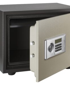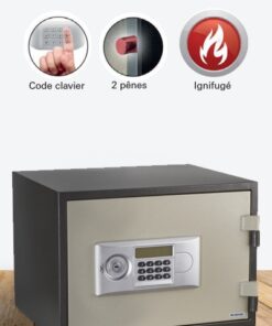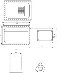 Steel chest. Heat and fire protection 01:00 User code from 6 to 8 digits. Internal power supply with 4 x 1.5V LR6 batteries (batteries included). Built-in alarm. Locking by 2 bolts chrome steel diam 20mm. 3 keys . Emergency key rescue (3 keys provided)