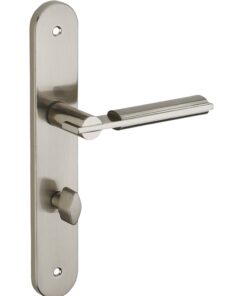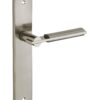 Description: Stamped steel plates. Molten alloy crutches. square steel 7 mm. Recall spring. Screws secable metals. Inter-axis of fixation 195 mm. Finish: Nickel-plated satin Version: Without hole for interior door. With condemnation button for bathroom door and W-C. With key hole for interior and exterior door. With European cylinder hole for exterior door. Usage: