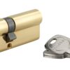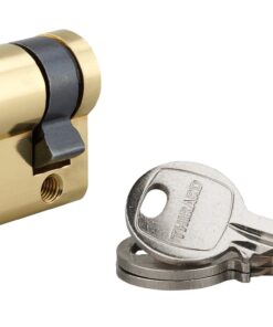 Description: European brass profile. Mechanism with 5 pins. Anti-tearing panel. 3 nickel-plated steel wrenches. Finish: Brass or nickel-plated Version: 40 mm screw for glass door. Screws of 45 and 50 mm for PVC and aluminum door. 60 mm screw for wooden door. Half cylinder 1 input. Cylinder 1 button input. Usage: