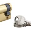 Description: European brass profile. Mechanism with 5 pins. Anti-tearing panel. 3 nickel-plated steel wrenches. Finish: Brass or nickel-plated Version: 40 mm screw for glass door. Screws of 45 and 50 mm for PVC and aluminum door. 60 mm screw for wooden door. Half cylinder 1 input. Cylinder 1 button input. Usage: