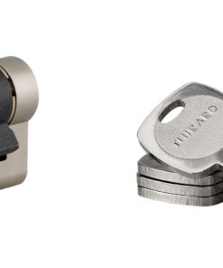 Description: European brass profile. Mechanism with 6 pins protection against hooking. Protection against drilling by 1st pin + hardened steel pusher. Protection against the break-in of the protruding part of the cylinder (anti-snap). Anti-tearing panel. 4 reversible flat keys nickel-plated brass with personal card. Finish: Nickel-plated Version: Half-cylinder. Cylinder 2 inputs. Cylinder 1 button input. Usage: