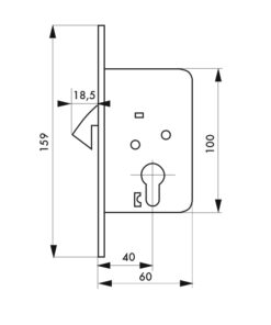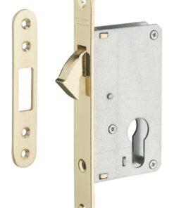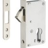 Description : Steel box stamped thickness 11 mm. Steel headrest round tips. Hook bolt. Flat steel striker. Handles bowl and draw on fields (except cylinder version). Condemnation model: 8 mm square, lock/unlock set. For door ep. 50 mm max. Finish: Satin chrome, brass Version: A condemnation. Has articulated key. Cylinder (delivered without bowl or draft). Use: Sliding door