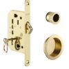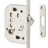 Description : Steel box stamped thickness 11 mm. Steel headrest round tips. Hook bolt. Flat steel striker. Handles bowl and draw on fields (except cylinder version). Condemnation model: 8 mm square, lock/unlock set. For door ep. 50 mm max. Finish: Satin chrome, brass Version: A condemnation. Has articulated key. Cylinder (delivered without bowl or draft). Use: Sliding door