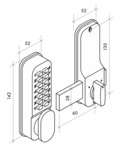 Description: Molded alloy chest. Mechanism with modifiable combination of 2 to 8 numbers or letters. 8,000 possible combinations. Changing the quick combination. Reversible right / left. For door thickness 32 to 55 mm max. Finish: Matte chrome Version: Lock with recessed U-turn bolt. With hook bolt for sliding door Use: Interior door