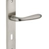 Description: Stamped steel plates. Molten alloy crutches. square steel 7 mm. Screws secable metals. Inter-axis of fixation 195 mm. Finish: Brushed nickel plated Version: Without hole for interior door. With condemnation button for bathroom door and W-C. With key hole for interior and exterior door. With European cylinder hole for exterior door. Usage: