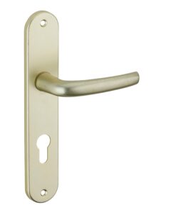 Description: Stamped aluminum plates. Molten aluminum crutches. square steel 7 mm. Screws secable metals. Fixing spacing 195 mm. Finish: Anodized silver or color F2 Version: Without hole for interior door. With condemnation button for bathroom door and W-C. With key hole for interior and exterior door. With European cylinder hole for exterior door. Usage: