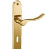 Description: Stamped brass plates. Solid brass crutches. square steel 7 mm. Screws metals brass to socket. For door ep. 45 mm max. Between the axes of attachment 195 mm. Finish: Polished brass Version: Without hole for interior door. With condemnation button for bathroom door and W-C. With key hole for interior and exterior door. With European cylinder hole for exterior door. Usage: