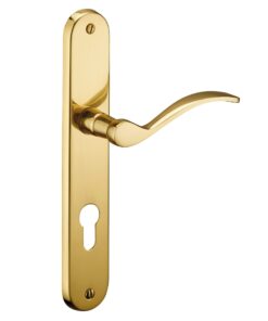 Description: Stamped brass plates. Solid brass crutches. square steel 7 mm. Screws metals brass to socket. For door ep. 45 mm max. Between the axes of attachment 195 mm. Finish: Polished brass Version: Without hole for interior door. With condemnation button for bathroom door and W-C. With key hole for interior and exterior door. With European cylinder hole for exterior door. Usage: