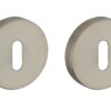 Description : Rosette steel stamped. Invisible fastening by metal screws. Finish: Anodized silver or color F2 / nickel-plated satin Version: Stainless steel 304. With condemnation button and indicator light for bathroom door and W-C. With key hole for interior and exterior door. With European cylinder hole for exterior door. Usage: