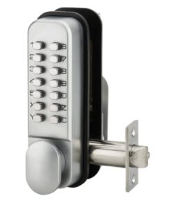 Description: Molded alloy chest. Mechanism with modifiable combination of 2 to 8 numbers or letters. 8,000 possible combinations. Changing the quick combination. Reversible right / left. For door thickness 32 to 55 mm max. Finish: Matte chrome Version: Lock with recessed U-turn bolt. With hook bolt for sliding door Use: Interior door