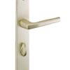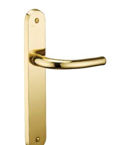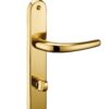 Description: Solid brass plates. Solid brass crutches. Reminder spring of the crutch. square steel 7 mm. Screws metals brass to socket. For door ep. 45 mm max. Inter-axis of fixation 195 mm. Finish: Polished brass Version: Without hole for interior door. With condemnation button for bathroom door and W-C. With key hole for interior and exterior door. With European cylinder hole for exterior door. Usage: