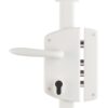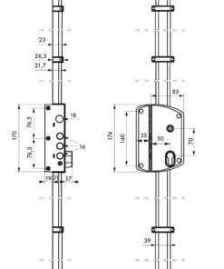 Description : Epoxy painted case in stamped steel, arched headrest ep. 20/10th. Trunk of 85 x 174 mm, axis at 50 mm, centre distance 70 mm. Standard rods allowing a door condemnation from 1.95 m to 2.20 m. Mechanism allowing the mandu 1/2 turn with the key, from inside as well as outside. 3 deadbolts Ø 16 mm and 1 bolt 1/2 turn Ø 18 mm in nickel-plated steel. High and low bolts in nickel-plated steel Ø 14 mm on telescopic steel rods allowing a very precise adjustment to the desired length. Low striker in galvanized steel ep. 3 mm. Square 7 mm. Double kickstand provided. Installation of rods and rod covers, without cross-checking. Use a 30 x 65 mm cylinder for a 45 mm thick door. Finish: Epoxy gold or white. Version: Right or left. Usage: