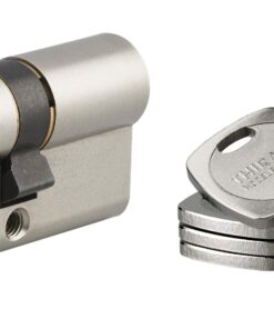 Description: European brass profile. Mechanism with 8 pinsagainst hooking. Protection against needle drilling + 1st pin + hardened steel pusher. Protection against the break-in of the protruding part of the cylinder (anti-snap). Anti-tearing panel. 4 reversible flat keys nickel-plated brass with property card. Finish: Nickel velvet Version: Half cylinder. Cylinder 2 inputs. Cylinder 1 button input. Emergency function: Possibility to insert a key into the cylinder and turn the panel even if a key is engaged inside (detachable panel). Padlock, thresher, contactor barrel. Adjustable panel for the dimension 30×10 (other dimensions on request). Possibility of mounting with detachable button. Possibility of mounting on flowchart with 3 keys. Usage: