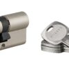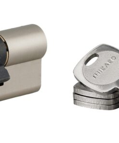 Description: European brass profile. Mechanism with 6 pins protection against hooking. Protection against drilling by 1st pin + hardened steel pusher. Protection against the break-in of the protruding part of the cylinder (anti-snap). Anti-tearing panel. 4 reversible flat keys nickel-plated brass with personal card. Finish: Nickel-plated Version: Half-cylinder. Cylinder 2 inputs. Cylinder 1 button input. Usage: