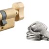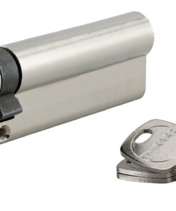 Description: European brass profile. 5-pin mechanism Lock cylinder with anti-tear panel. 3 nickel-plated brass keys. Finish: Nickel-plated Version: Half cylinder 1 input. Cylinder 1 button input. Reduced panneton. Usage:
