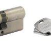 Description: European brass profile. Mechanism with 5 pins. Protection against drilling by 1st pin + hardened steel pusher. Anti-tearing panel. 3 flat mesh keys with property card allowing the reproduction of keys exclusively in the factory. Anti-hooking moving part internal to the cylinder prohibiting any reproduction outside the factory. Option: Anti-piercing needle. Finish: Nickel velvet Version: Half cylinder. Cylinder 2 inputs. Cylinder with button 1 input. Possibility of mounting with detachable panel. Adjustable panel for dimensions 30 x 10 and 35 x 10. (other dimensions on request). Service Point available. Possibility of mounting with detachable button. Use: Flowchart System