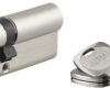 European brass profile. 7 to 16 nickel silver pin mechanism.Protection against the destruction of theprojecting portion of the cylinder (anti-snap). Drivercam made of powdered metal. 3 reversible brass nickelplated keys with a personal security card for key copies.Option :Protection against drilling by hardened steel insert and pins.