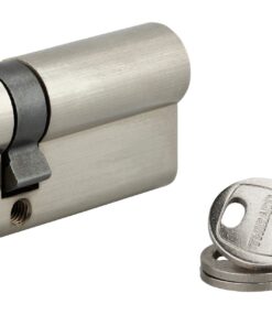 Description: European brass profile. Mechanism with 5 pins. Anti-tearing panel. 3 nickel-plated steel wrenches. Finish: Brass or nickel-plated Version: 40 mm screw for glass door. Screws of 45 and 50 mm for PVC and aluminum door. 60 mm screw for wooden door. Half cylinder 1 input. Cylinder 1 button input. Usage: