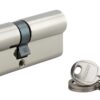 Description: European brass profile. Mechanism with 5 pins. Anti-tearing panel. 3 nickel-plated steel wrenches. Finish: Brass or nickel-plated Version: 40 mm screw for glass door. Screws of 45 and 50 mm for PVC and aluminum door. 60 mm screw for wooden door. Half cylinder 1 input. Cylinder 1 button input. Usage: