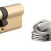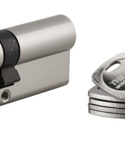 Description: European brass profile. Mechanism with 6 pins against hooking. Protection against needle drilling and 1st pin in hardened steel. Anti-tearing panel. Emergency function Detachable breakdown: opening possible from the outside even if a key has remained inside (except boxed packaging). 5 reversible flat keys nickel-plated brass with property card. Finish: Nickel satin, brass Version: Half cylinder – Cylinder 2 inputs – Cylinder 1 input button. Reduced panel – Possibility to open (comes with 4 keys). Long keys. Usage: