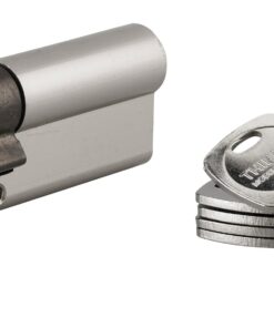 Description: European brass profile. Mechanism with 6 pins against hooking. Protection against needle drilling and 1st pin in hardened steel. Anti-tearing panel. Emergency function Detachable breakdown: opening possible from the outside even if a key has remained inside (except boxed packaging). 5 reversible flat keys nickel-plated brass with property card. Finish: Nickel satin, brass Version: Half cylinder – Cylinder 2 inputs – Cylinder 1 input button. Reduced panel – Possibility to open (comes with 4 keys). Long keys. Usage: