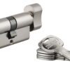 Description: European brass profile. Mechanism with 5 pinsAnti-tear pan. 3 nickel-plated brass keys. Finish: Nickel-plated Version: Half cylinder 1 input. Lock cylinder 1 button input. Reduced panneton. Usage: