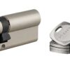 Description: European brass profile. Mechanism with 6 pins protection against hooking. Protection against drilling by 1st pin + hardened steel pusher. Protection against the break-in of the protruding part of the cylinder (anti-snap). Anti-tearing panel. 4 reversible flat keys nickel-plated brass with personal card. Finish: Nickel-plated Version: Half-cylinder. Cylinder 2 inputs. Cylinder 1 button input. Adjustable panel for the dimension 30×10 (other dimensions on request). Emergency function: Possibility to insert a key into the cylinder and turn the panel even if a key is engaged inside (detachable panel). Usage: