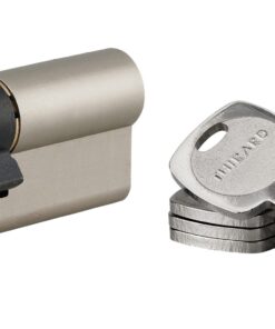 Description: European brass profile. Mechanism with 6 pins protection against hooking. Protection against drilling by 1st pin + hardened steel pusher. Protection against the break-in of the protruding part of the cylinder (anti-snap). Anti-tearing panel. 4 reversible flat keys nickel-plated brass with personal card. Finish: Nickel-plated Version: Half-cylinder. Cylinder 2 inputs. Cylinder 1 button input. Adjustable panel for the dimension 30×10 (other dimensions on request). Emergency function: Possibility to insert a key into the cylinder and turn the panel even if a key is engaged inside (detachable panel). Usage:
