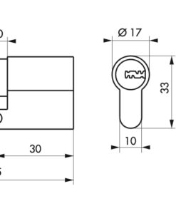 Description: European brass profile. Mechanism with 6 pins protection against hooking. Protection against drilling by 1st pin + hardened steel pusher. Protection against the break-in of the protruding part of the cylinder (anti-snap). Anti-tearing panel. 4 reversible flat keys nickel-plated brass with personal card. Finish: Nickel-plated Version: Half-cylinder. Cylinder 2 inputs. Cylinder 1 button input. Adjustable panel for the dimension 30×10 (other dimensions on request). Emergency function: Possibility to insert a key into the cylinder and turn the panel even if a key is engaged inside (detachable panel). Usage: