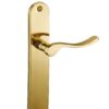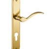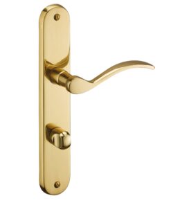 Description: Stamped brass plates. Solid brass crutches. square steel 7 mm. Screws metals brass to socket. For door ep. 45 mm max. Between the axes of attachment 195 mm. Finish: Polished brass Version: Without hole for interior door. With condemnation button for bathroom door and W-C. With key hole for interior and exterior door. With European cylinder hole for exterior door. Usage: