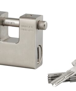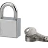 Description: Chrome cemented steel body. Handle cemented steel. Pin mechanism. Padlock comes with 5 reversible keys. Finish: Nickel satin Version: Use: Construction site